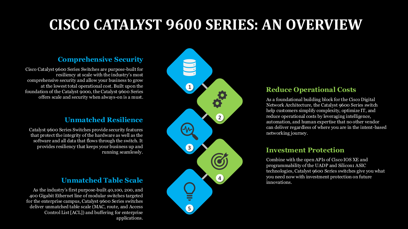 Cisco Catalyst 9600 Series Switches are purpose-built for resiliency at scale with the industry’s most comprehensive security and allow your business to grow at the lowest total operational cost. Built upon the foundation of the Catalyst 9000, the Catalyst 9600 Series offers scale and security when always-on is a must.