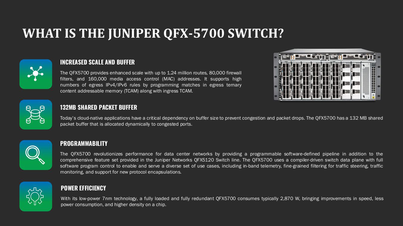 The QFX5700 revolutionizes performance for data center networks by providing a programmable software-defined pipeline in addition to the comprehensive feature set provided in the Juniper Networks QFX5120 Switch line. The QFX5700 uses a compiler-driven switch data plane with full software program control to enable and serve a diverse set of use cases, including in-band telemetry, fine-grained filtering for traffic steering, traffic monitoring, and support for new protocol encapsulations.